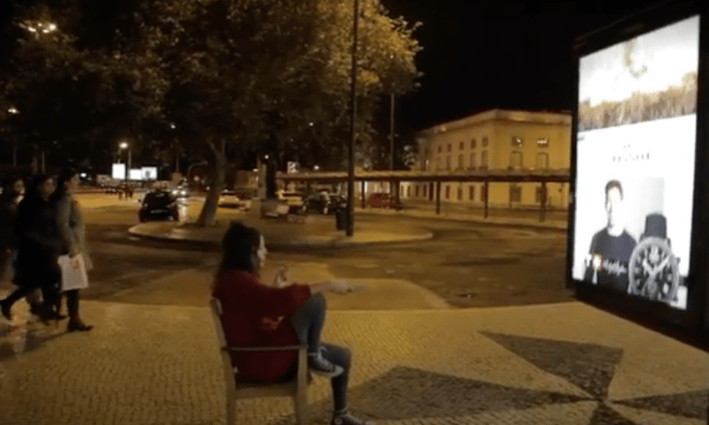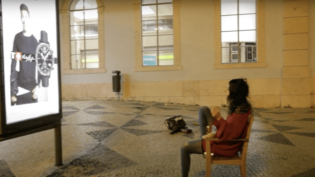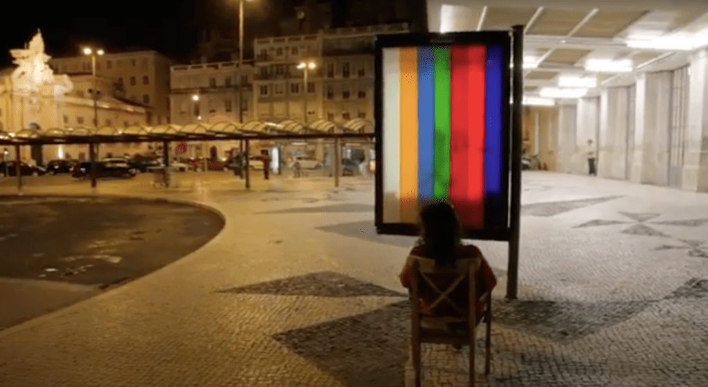 Channel 3 is a durational street performance that explores the relationship between communication, presence, and the technological sublime. The artist sits for hours in front of a Clear Channel street advertisement, watching it as if it were a television broadcast. Passersby stop, confused. Some engage. Others simply stand beside her and watch. After hours of passive observation, the artist covers the ad with strips of colored tape, recreating the SMPTE color bars—a universal signal for interruption or absence: “no signal.”